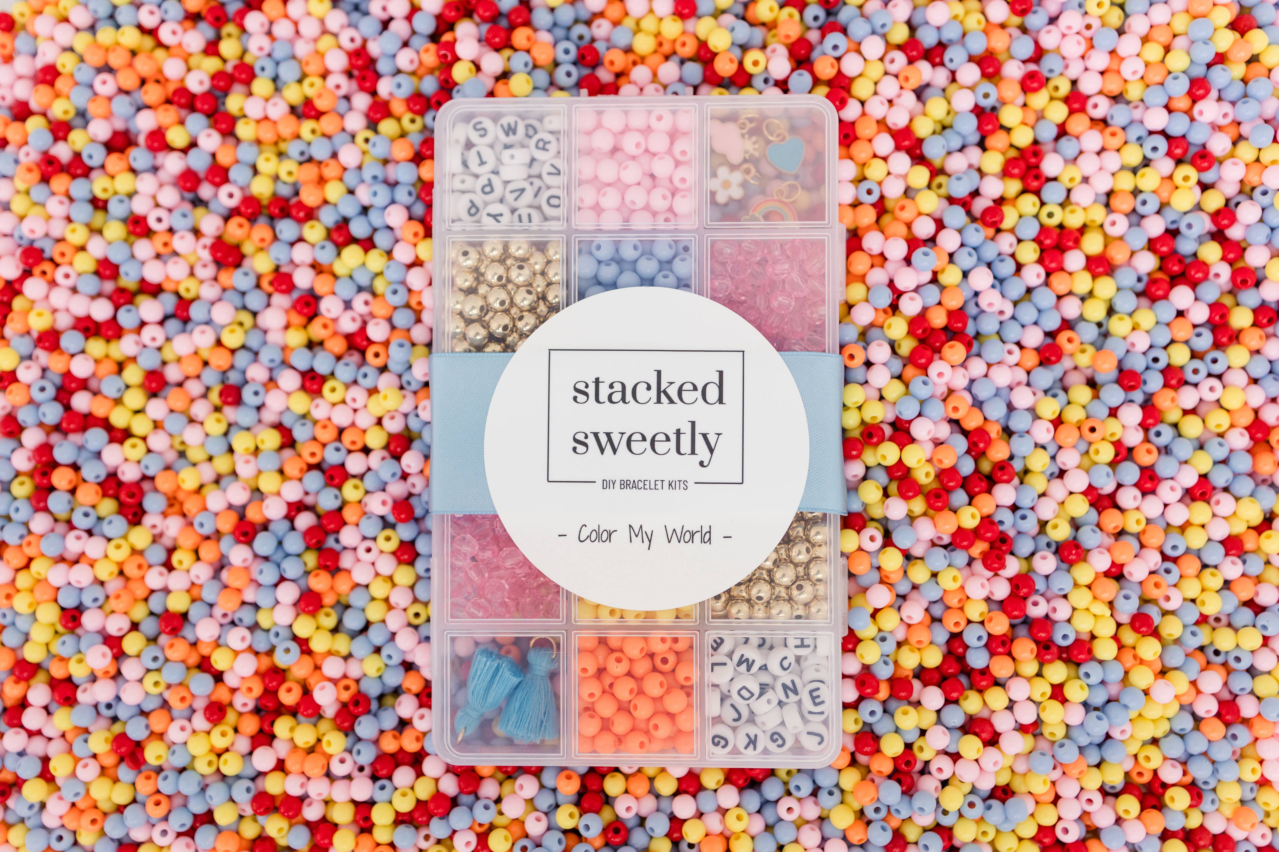 WHAT'S INCLUDED: - About 500 beads and 20 feet of stretch cording - 4 Enamel charms - 2 Tassel charms - Variety of alphabet letters - Storage Box