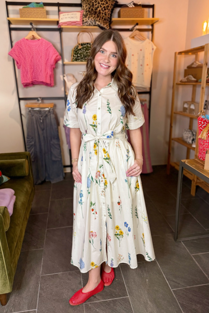 The Gardenia Dress is a sophisticated white floral maxi designed for spring's most memorable moments. Delicate blooms dance across lightweight fabric, while a structured belt cinches the waist for a flattering silhouette. The flowing skirt moves gracefully with every step, making it perfect for garden parties, weddings, or leisurely brunches. Versatile enough for day or evening, this dress transitions seamlessly from season to season with timeless appeal.