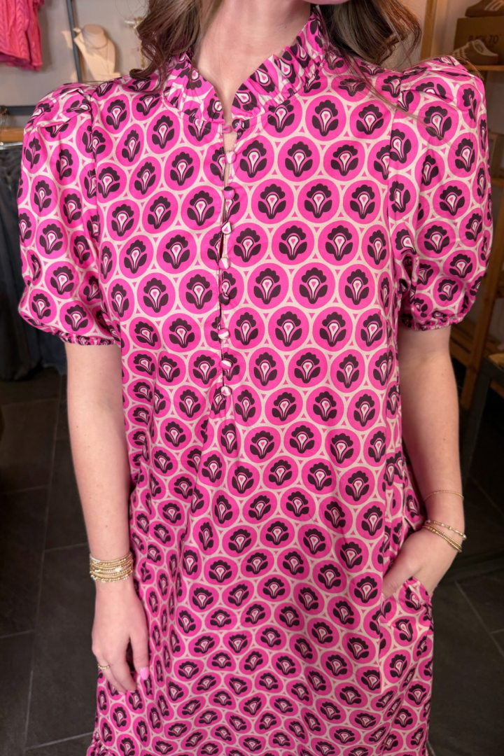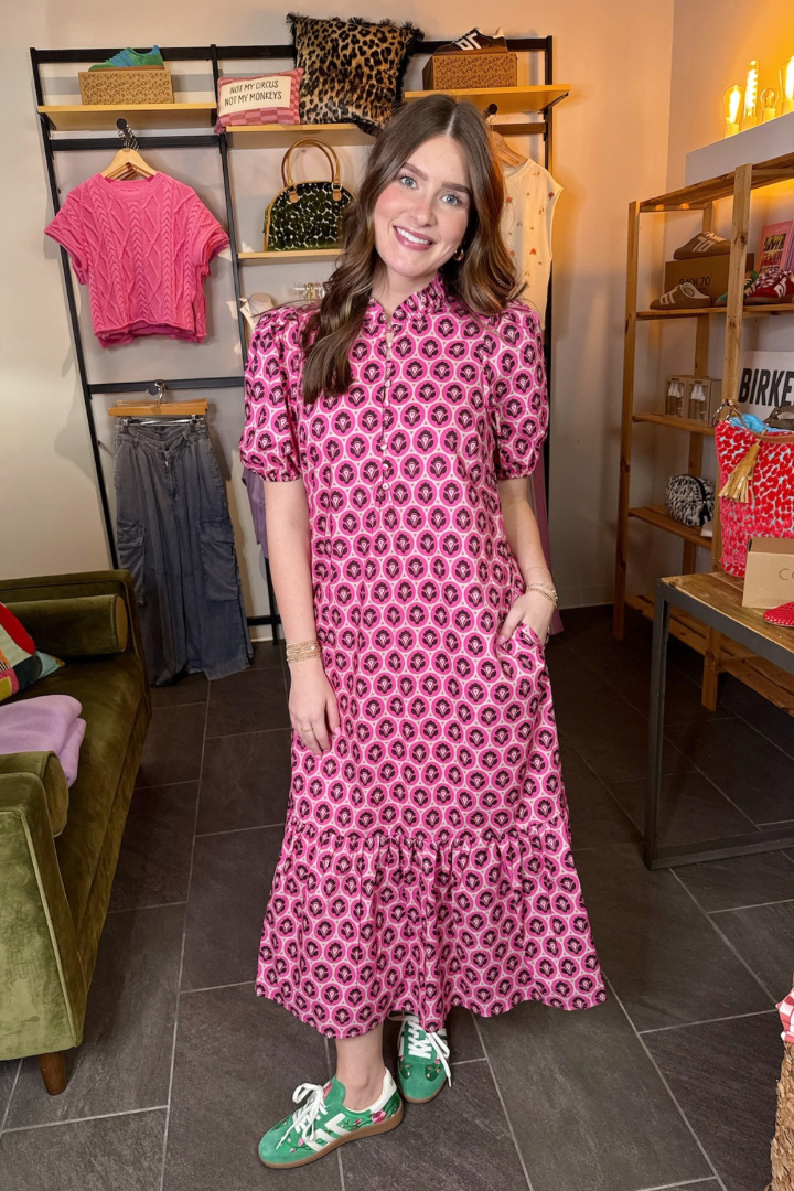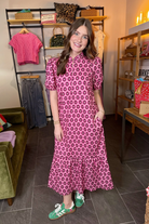 The tulip-printed midi dress is crafted from lightweight woven fabric and features a refined ruffled mock neck and delicate puff sleeves that add romantic dimension. The front button closure and practical side pockets offer both style and function, while the ruffle hem creates graceful movement. Fully lined for comfort and opacity, this spring essential transitions seamlessly from day to evening occasions.