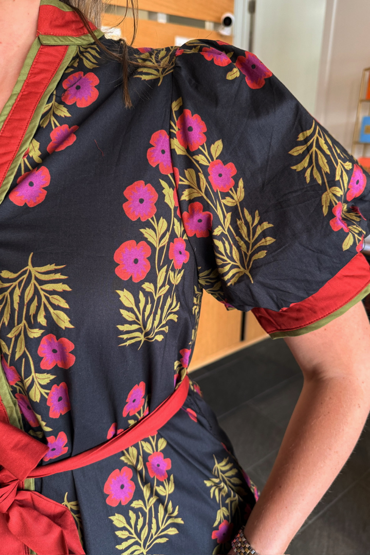 Step into fall with the Marcella Maxi Dress, a playful mix of florals and flirty details. This lightweight woven dress features short puff sleeves, a ruffle hem, and colorful accent bands that brighten every step. The V-neck with band collar and button closure adds charm, while the removable belt lets you shape your look. Plus, handy side pockets keep essentials close. Fully lined and non-sheer, it’s perfect for dancing through warm days with style and ease.